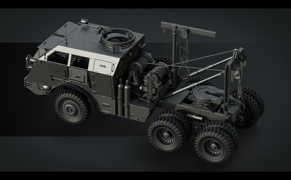 Model has high detailed mechanisms including winches, transmission, tires, suspension. All welding seems are hand sculpted. Thick metal details are damaged and sculpted.