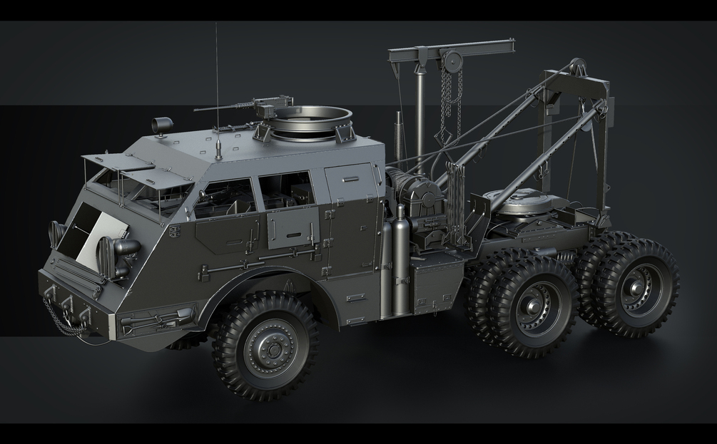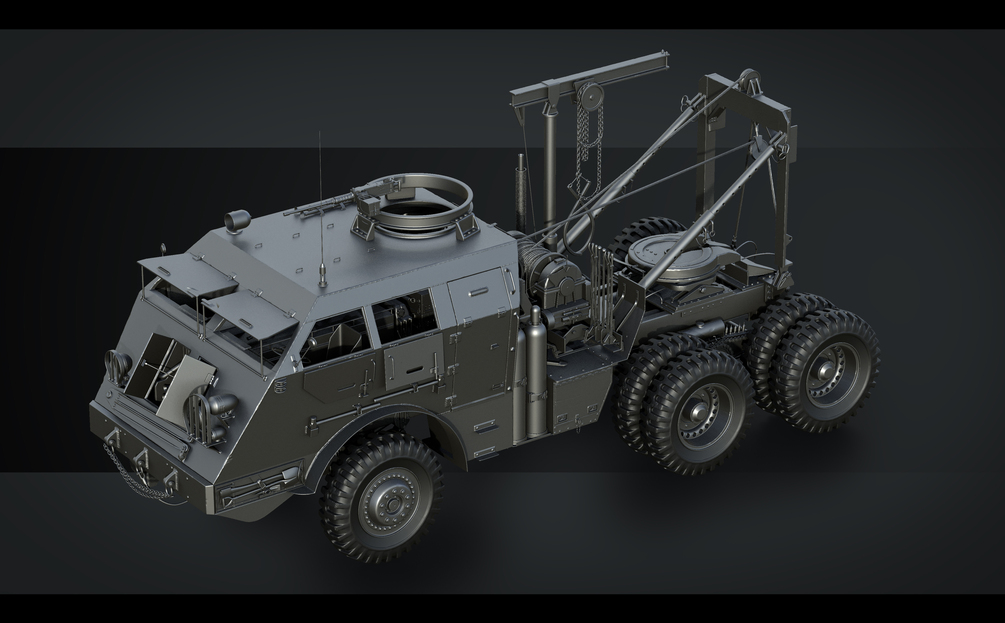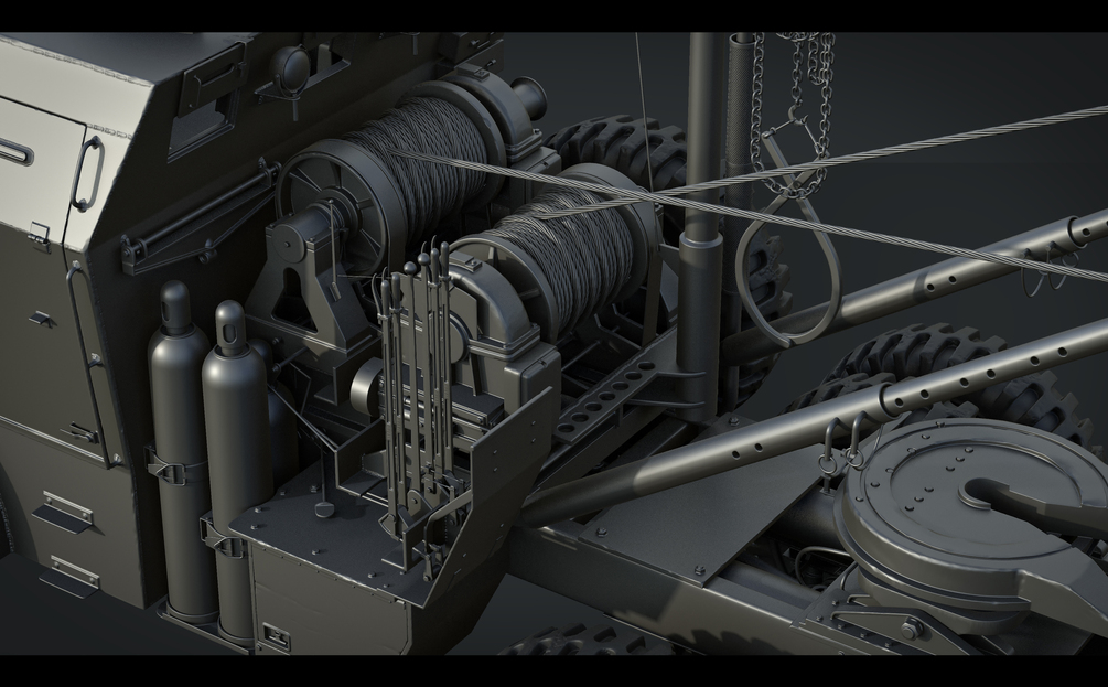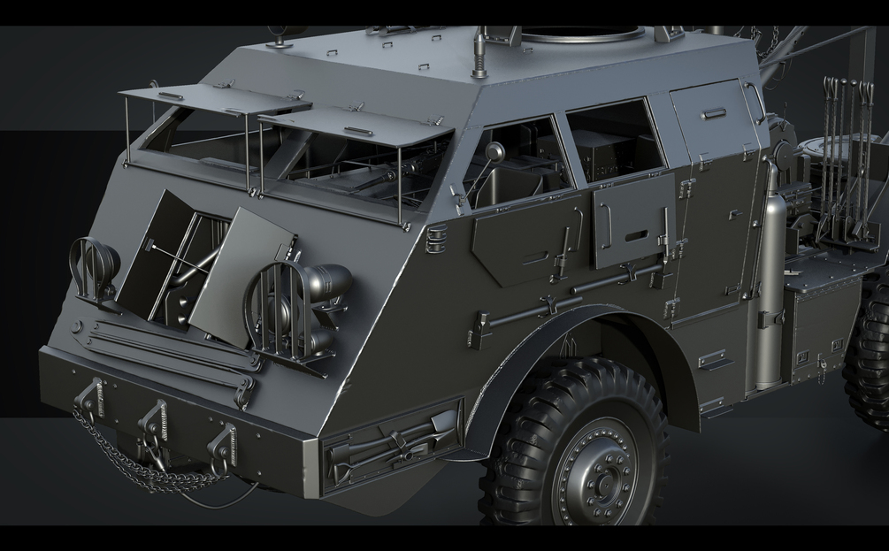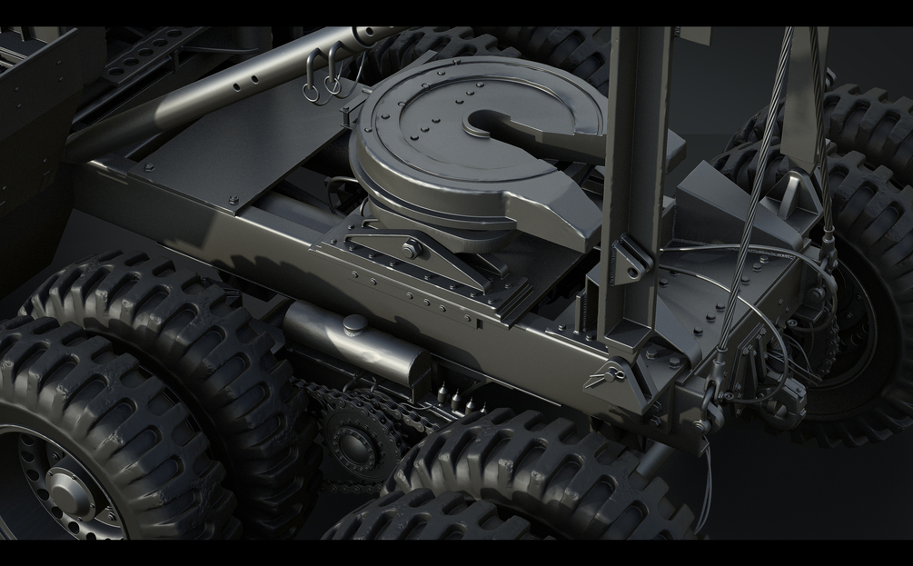 Model has high detailed mechanisms including winches, transmission, tires, suspension. All welding seems are hand sculpted. Thick metal details are damaged and sculpted.