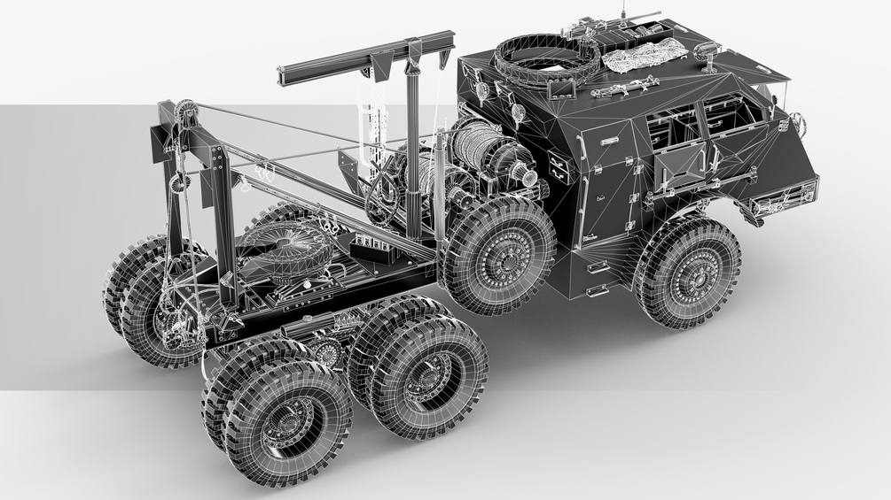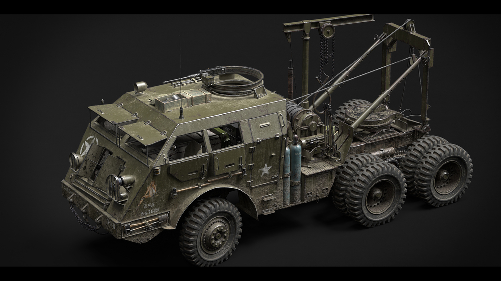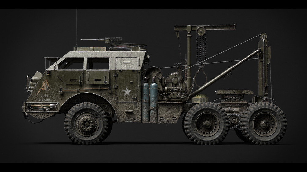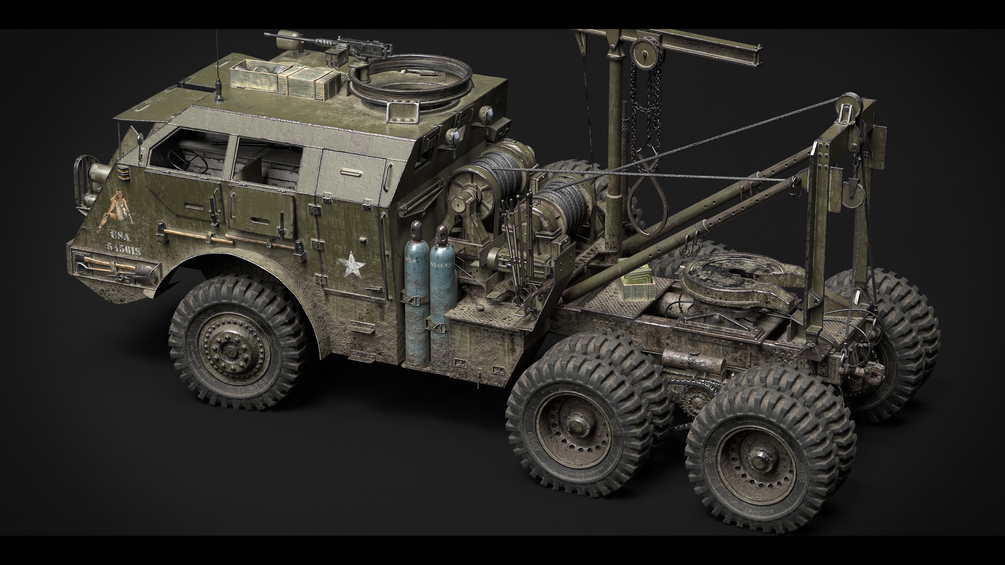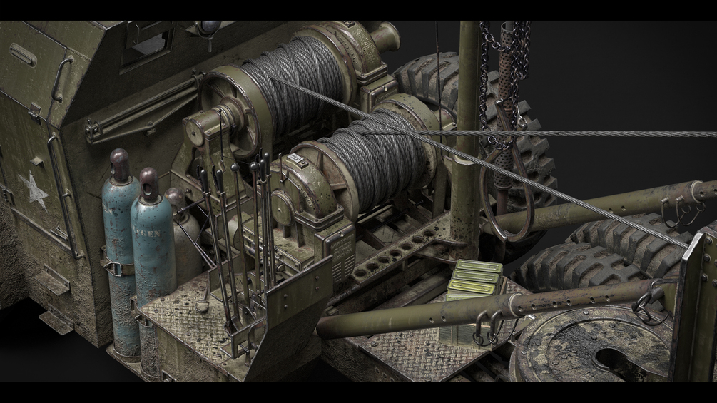 Model has high detailed mechanisms including winches, transmission, tires, suspension. All welding seems are hand sculpted. Thick metal details are damaged and sculpted.